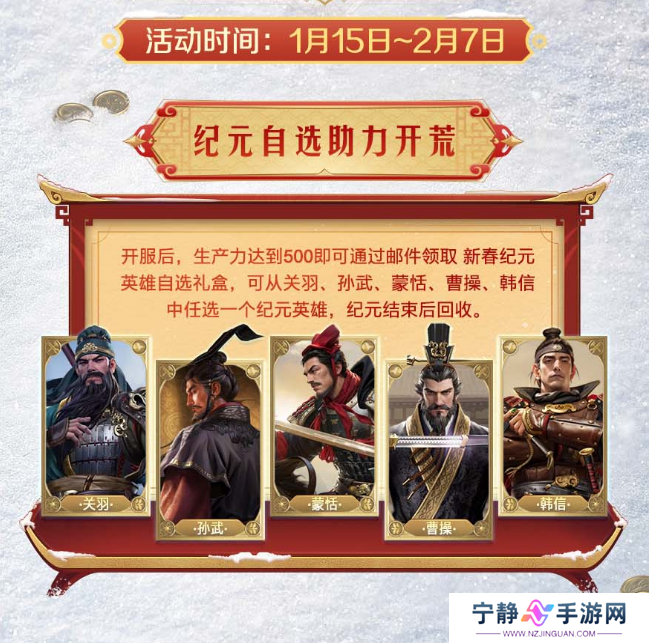 除了针对老玩家和当前玩家的福利外,此次半周年对新人玩家同样充满了诱惑力。游戏将在半周年推出“专属服务器”。在该服务器,生产力达到500即可领取“新春纪元自选英雄礼盒”,里面包含关羽、孙武、曹操、韩信等强力英雄,让玩家的初期体验直接起飞。
