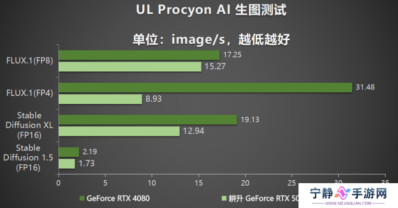 在常规的UL Procyon Stable Diffusion FP16测试中,特别是在处理Stable Diffusion XL模型上,耕升 GeForce RTX 5080追风平均12.94秒即可生成一张图像,比GeForce RTX 4080要快接近7秒,这一差距彰显出其卓越的性能表现。