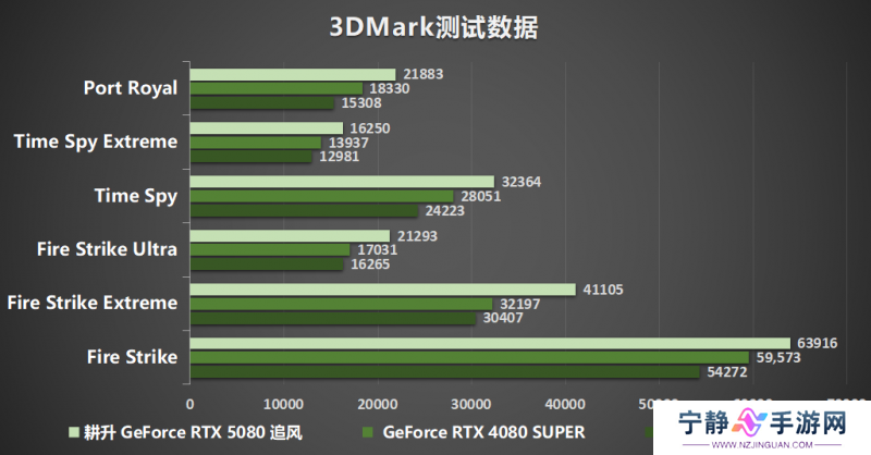 首先使用3D Mark软件对GPU进行基准测试。从测试结果上来看,耕升 GeForce RTX 5080 追风在多个数据指标上与GeForce RTX 4080 和GeForce RTX 4080 SUPER相比均有明显提升。其中在Fire Strike测试中,耕升 GeForce RTX 5080 追风的得分高达63916分,而在Port Royal测试中,其21883分的得分与GeForce RTX 4080 的15308分和GeForce RTX 4080 SUPER的18330分形成显著对比。总体而言,耕升 GeForce RTX 5080 追风在性能表现上相较于前代显卡有显著的提升,成功地拉大性能差距。由此可见,耕升 GeForce RTX 5080 追风拥有极为卓越的基础配置。