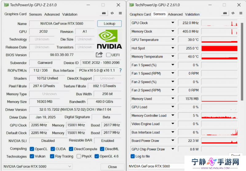 由检测软件GPU-Z可看到耕升 GeForce RTX 5080 追风更为具体的参数表现和实际规格。通过数据可以看到,在待机状态下,显卡温度为39.0℃,功耗为22.3W。