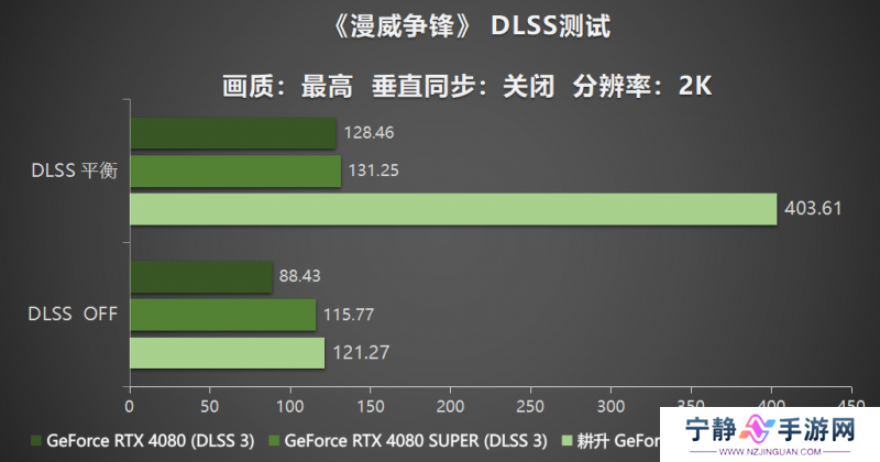 《漫威争锋》作为一款多人竞技游戏,更高的分辨率不仅能提升视觉效果,也能让玩家在激烈竞技中更加进准地捕捉到战场上的每一个变化,从而做出快速且准确的决策。通过测试可以看到,耕升 GeForce RTX 5080 追风开启DLSS 4后,在2K分辨率下可达到超过400帧的成绩,与前代显卡拉开了显著的差距。