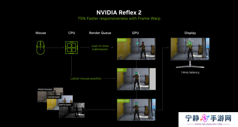 此外,全新NVIDIA Reflex 2技术还引入了Frame Warp技术,该技术可在渲染帧输出至显示器之前,依据实时捕捉的鼠标输入信号进行即时更新,降低游戏延迟,最高可降低 75% 。更低的延迟和更快的响应速度为玩家在FPS/TPS等游戏中带来出色的制胜优势。