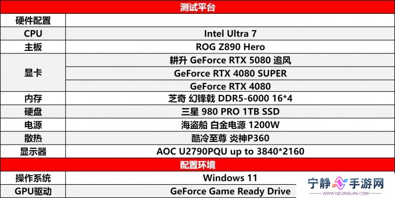 本次测试中,CPU选用了Intel Ultra 7,搭配ROG Z890 HERO主板,内存方面搭载了4条芝奇 幻锋戟 DDR5-6000Hz 16GB内存条,电源方面则采用了海盗船 白金1200W电源,散热部分则使用了酷冷至尊 炎神P360一体式水冷。这套经过精心设计的配置,不仅为GPU提供了充足的散热保障,还确保了稳定的电力供应,使得耕升 GeForce RTX 5080 追风在日常使用中得以充分展现其强大性能。同时,本次测试将直接对比GeForce RTX 4080和GeForce RTX 4080 SUPER,带大家领略耕升 GeForce RTX 5080 追风的非凡实力。