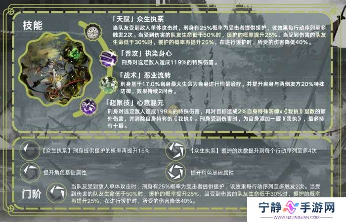 其中1.3阶是提高援护队友的概率,而4阶是增加每回合可以援护队友的次数,再加上刑身是五星角色,4阶的话难度不大。