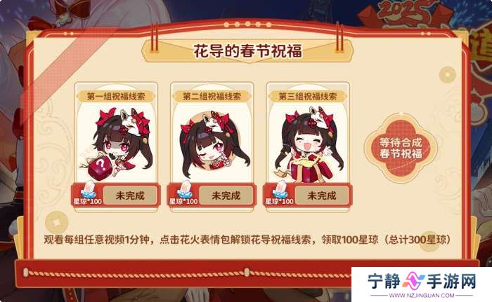 观看每组任意视频1分钟,点击花火表情包解锁花导祝福线索,领取100星琼(总计300星琼)