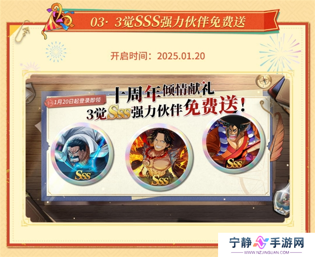 在这次十周年庆典中,《航海王启航》为每位玩家准备了丰厚的礼物。玩家只需登录游戏,就有机会免费领取以下任意一个所选伙伴提升至3觉的碎片数量:SSS火拳艾斯、SSS光月御殿、SSS海军英雄·戈普。这些强大的伙伴将助您一臂之力,让您的战力更上一层楼。同时,只要玩家在活动期间每日登录游戏,就可以免费领取一名全新的伙伴。而且,这次活动共计可领取100名伙伴,让您的航海之旅更加丰富多彩。
