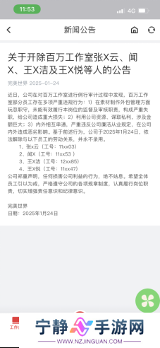 根据一份流传到网上的内部公告,1月24日,完美世界开除了百万工作室四人,其违规行为包括在素材制作外包管理方面玩忽职守,构成严重失职;利用公司资源、谋取利益,涉及金额巨大;内外相互串通,严重违反公司廉洁从业规定等,对张X云、闻X、王X洁、王X悦等四人进行解除劳动关系和永不录用的处理。