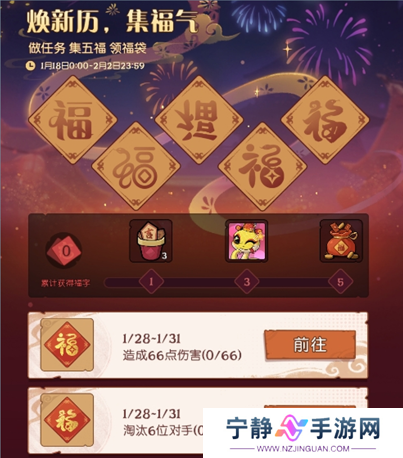 新春到,做任务,集五福,领福袋!1月18日00:00~2月2日23:59期间,完成对局任务可以集福,集齐指定数量的"福"可在活动界面领取对应奖励,注意本次活动未领取的奖励不会补发,请务必前往奖励界面领取。