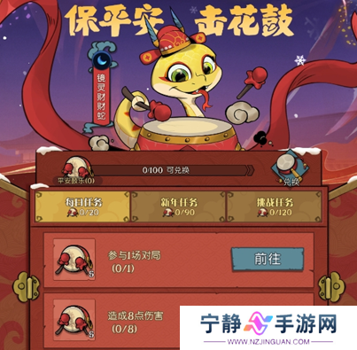 新年击花鼓,吉运伴君赴!1月28日00:00~2月10日23:59期间,参与每日任务、新年任务和挑战任务三种花鼓任务,领取奖励道具【平安鼓乐】,该道具可在活动兑换商店内兑换镜灵【财财蛇】、珍藏棋盒等奖励。听着熟悉的韵律,让鼓点保佑你平安过新年。