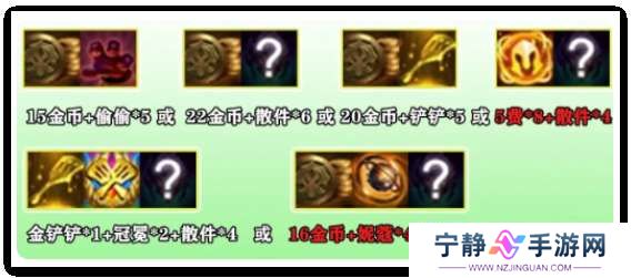 偷偷*1、9金币+散件*1、9金币+3费卡*3、散件*2、12金币+妮蔻