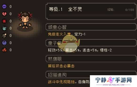 全不灵的根骨、身法以及悟性不错,因此所拥有的技能也会比较多,邀请入队后可以让主角学会江湖飘酒艺指法,其绝技是真踩脚指,伤害很高而且CD时间短,在面对单体敌人时作用非常不错,因此建议及早学习。由于本身就是个孩子,因此属性具有顽童心智,学习东西很快可以免疫走火入魔,但容易分心,所以定力会减少,而童子身的特点可以具有轻功、暴击、连击等输出能力的增强,身法灵活,拥有熬鹰眼后在背后攻击必定会产生暴击,同时还会拥有招猫递狗的特性,无视阻挡更适合切到对方关键角色打出高额输出。
