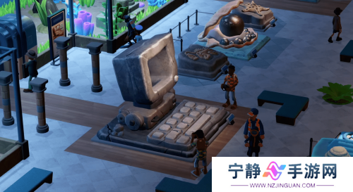 荒诞幽默加上轻松的玩法,一直是《双点》系列的底色,《双点博物馆》也保持了系列惯例。最显眼的例子便是各类稀奇古怪的展品。诸如冰封原始人、深海大怪鱼、石制显示器等文物被堂而皇之地摆放在不同的展区,构成了一幅幅抽象奇景。