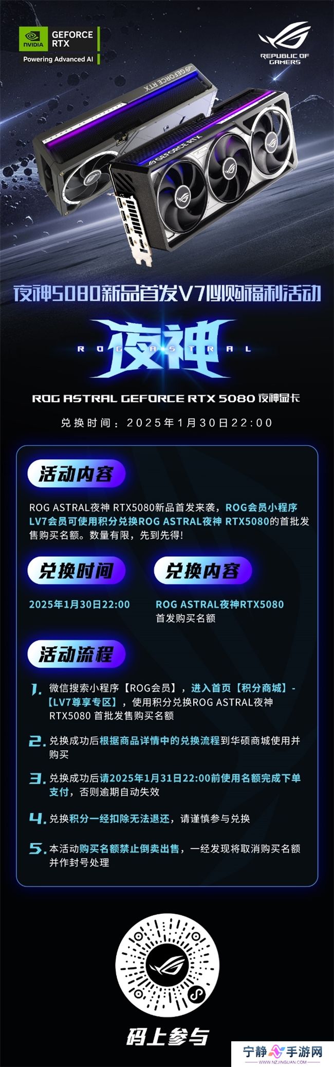 值得一提的是,ROG会员小程序LV7会员,可使用积分兑换首批ROG ASTRAL夜神显卡发售的购买名额!2025年1月30日22:00开启兑换,各位玩家登录小程序【ROG会员】,进入首页【积分商城】-【LV7尊享专区】,使用积分兑换ROG ASTRAL夜神 RTX5080 首批发售购买名额!,兑换成功后根据商品详情中的兑换流程到华硕商城使用并购买~提示:兑换成功后请2025年1月31日22:00前使用名额完成下单支付,否则逾期自动失效噢~