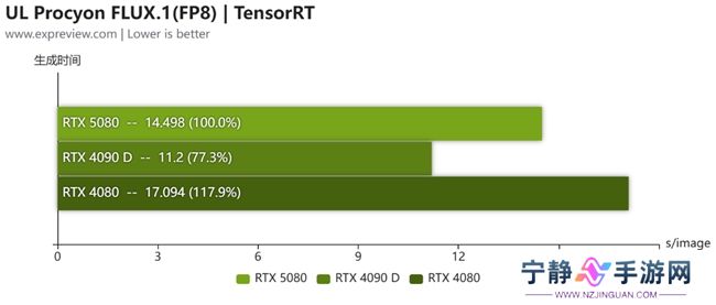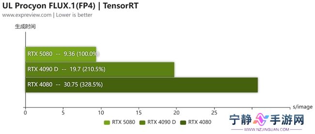 在AI与生产力测试中,ROG ASTRAL夜神RTX 5080显卡使用Blackwell架构,其内置的第五代Tensor Core支持FP4精度的计算 ,增加了对FP4运算的加速支持,在使用FLUX.1模型FP4精度时,图像生成所用时间甚至比RTX 4090 D更快,生图时间只需要RTX 4090 D的一半,是RTX 4080所用时间的三分之一,效果十分明显!
