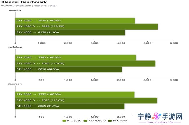 在生产力上的表现中,像V-Ray这种涉及光追的项目就领先RTX 4080超过20%,幅度较为明显;在Blender Benchmark测试的三个不涉及光追项目,也有10%左右的提升!