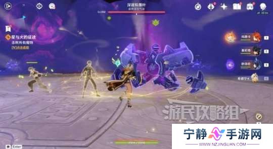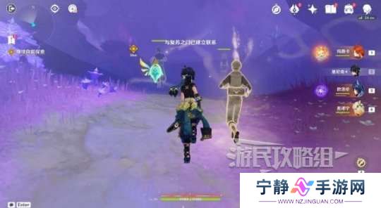 依然是旅行者视角,在拾取【宝箱1】后穿过大门,继续沿路前进会触发对话,触发其他灵魂帮忙,站在金色罩子内穿过紫色雾气,前方需要击败魔物。