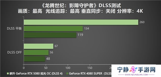 《龙腾世纪:影障守护者》是一款支持光线追踪技术的游戏,为确保游戏画面的流畅和细腻,使得玩家在这款游戏中所需的硬件配置也随之提高。在测试中可以看到,耕升 GeForce RTX 4080 SUPER和GeForce RTX 4080 在最高画质、光线追踪开启、DLSS打开时,4K分辨率下GeForce RTX 4080 SUPER有134帧,GeForce RTX 4080有119帧,两款显卡都有着比较优异的性能。而耕升 GeForce RTX 5080 炫光 OC能够达到260帧的超高性能。可见《龙腾世纪:影障守护者》在启用DLSS 4后,耕升 GeForce RTX 5080 炫光 OC在4K分辨下的帧数表现,拥有近94%的性能提升。