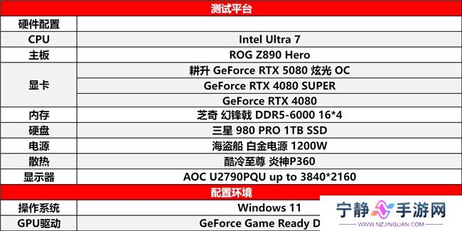 本次测试中,CPU选用了Intel Ultra 7,搭配ROG Z890 HERO主板,内存方面搭载了4条芝奇 幻锋戟 DDR5-6000Hz 16GB内存条,电源方面则采用了海盗船 白金1200W电源,散热部分则使用了酷冷至尊 炎神P360一体式水冷。这套经过精心设计的配置,不仅为GPU提供了充足的散热保障,还确保了稳定的电力供应,使得耕升 GeForce RTX 5080 炫光 OC在日常使用中得以充分发挥其高效及卓越的性能。同时,本次测试将直接对比GeForce RTX 4080和GeForce RTX 4080 SUPER,带大家领略耕升 GeForce RTX 5080 炫光 OC 的强大性能。
