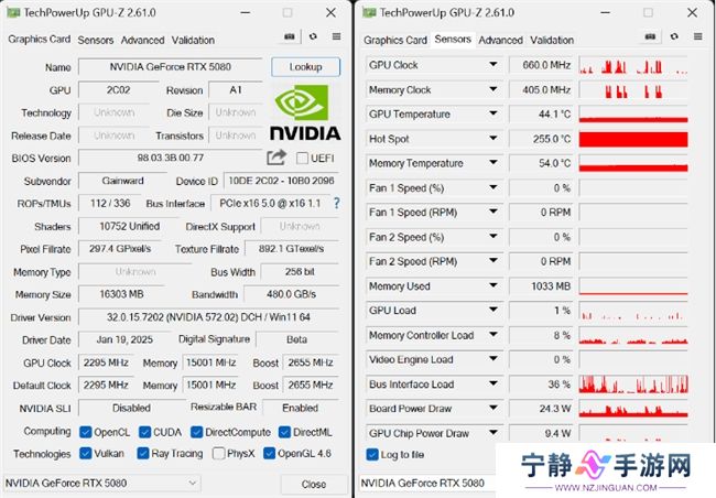 由检测软件GPU-Z可看到耕升 GeForce RTX 5080 炫光 OC更为具体的参数表现和实际规格。通过数据可以看到,在待机状态下,显卡温度为44.1℃,功耗为24.3W。
