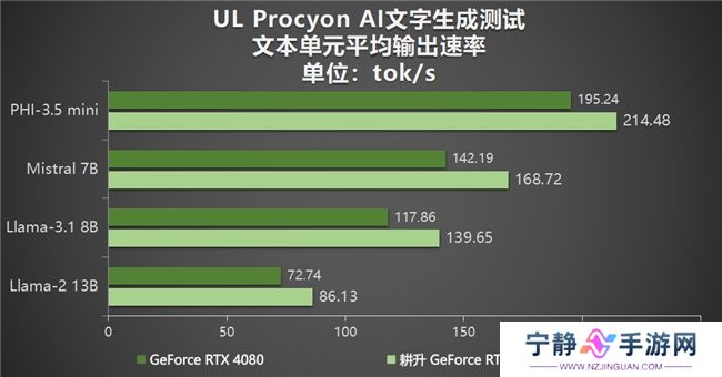在UL Procyon AI的文字生成能力评估中,分别对PHI-3.5 mini、Mistral-7B、Llama-3.1 8B以及Llama-2 13B四种模型进行测试。UL Procyon平台将依托这些模型,执行一连串的AI计算任务,进而依据任务完成情况,对这些模型的文本单元平均输出速率表现进行评估,数值越高越优秀。