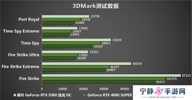 通过3D Mark软件的基准测试,可以发现耕升 GeForce RTX 5080 炫光 OC在各项指标上的分数,比GeForce RTX 4080 和GeForce RTX 4080 SUPER 均有很大提升。尤其是在Fire Strike测试中,耕升 GeForce RTX 5080 炫光 OC 的分数高达67112分,较GeForce RTX 4080 SUPER 和GeForce RTX 4080分别实现了13%和24%的增幅,彰显出其卓越的性能表现。
