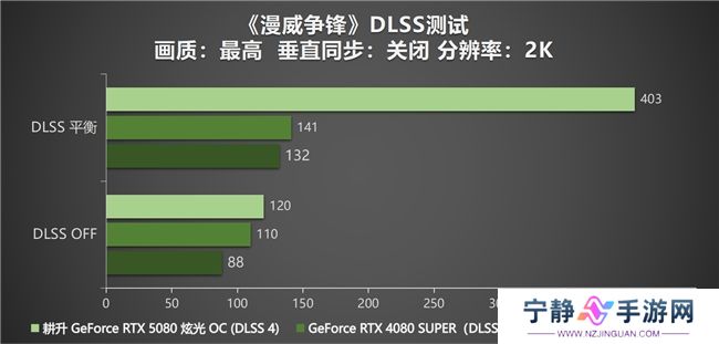 在2K分辨率的测试下,耕升 GeForce RTX 4080 SUPER和GeForce RTX 4080 在启用DLSS 3技术的情况下,游戏的帧数分别达到平均141帧和132帧的。而耕升 GeForce RTX 5080 炫光 OC在开启DLSS 4后的帧数达到了平均403帧,相较于前两代显卡有着超大幅度的性能提升,轻松地拉开了性能差距。
