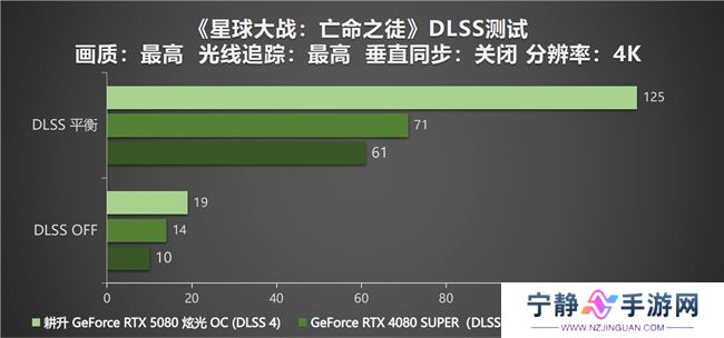《星球大战:亡命之徒》是一款对硬件配置的要求较高的游戏,从测试结果可以看出,在4K的分辨率下,GeForce RTX 4080 SUPER和GeForce RTX 4080在开启DLSS 3技术时,平均帧数分别为61帧和71帧。耕升 GeForce RTX 5080 炫光 OC在DLSS 4技术的加持下,平均帧数可以达到125帧,其性能提升涨幅约为76%,由此可见,在对硬件配置要求极高的《星球大战:亡命之徒》中,玩家使用耕升 GeForce RTX 5080 炫光 OC可以带来优异的游玩体验,让玩家更加投入和享受游戏过程。