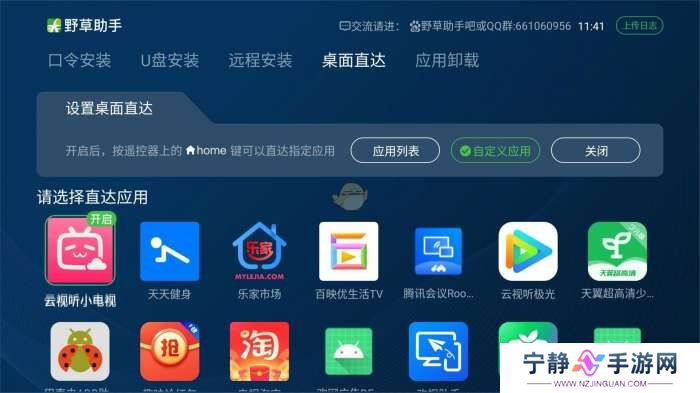 4、桌面直达功能:选择“自定义应用”后,选择一个应用进行“开启”,按home键后即可直接打开刚才选择的应用首页