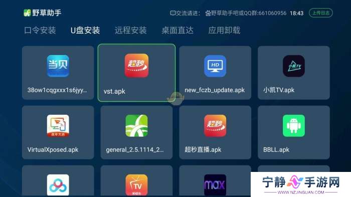 2、插入U盘后,在【U盘安装】页面中,会自动检测U盘中的apk文件,选择点击一个apk文件后,即可安装