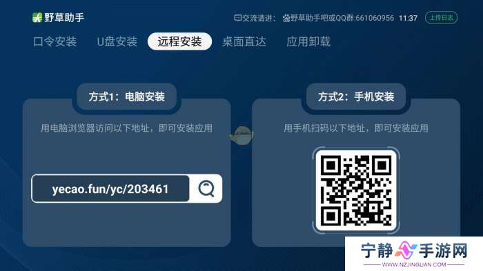 3、远程安装页面中,可以在电脑或手机浏览器中输入页面左边部分的地址,或者使用手机扫一扫右边部分的二维码,可以直接打开相应的远程安装页面,选择手机或电脑中的apk文件 (注意确认结尾是apk的文件,否则找不到这个应用文件),在页面中上传,上传完成后,会自动在电视端下载安装。