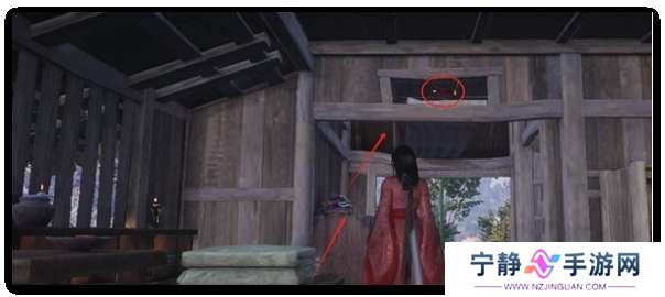 2、在小屋内使用缩骨奇术需要我们去对着房梁然后就可以点轻功跳上去那么就可以发现这个掌中宝。